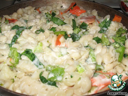 Отварить макароны, смешать с овощами и выложить на фарш. Набор овощей по желанию. У меня это в сыром виде шпинат. Цветная капуста, брокколи, морковь, лук и болгарский перец слегка потушены. Соединить яйца, молоко и сметану и залить ими запеканку, поставить в духовку на 40 минут.