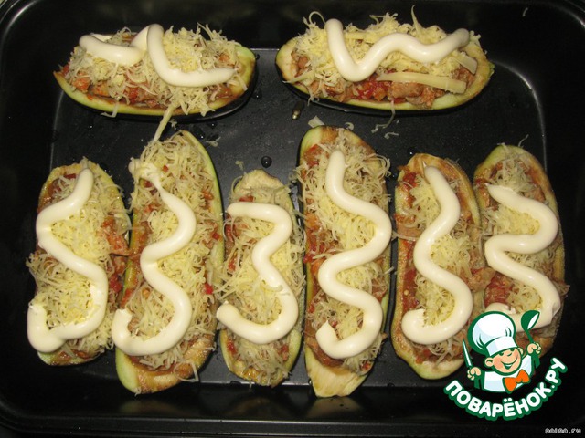 Оболочку баклажан промыть водой и начинить фаршем,посыпать сыром и полить сверху майонезом!Выложить баклажаны в форму для запекания и поставить в духовку на 30-35 мин!