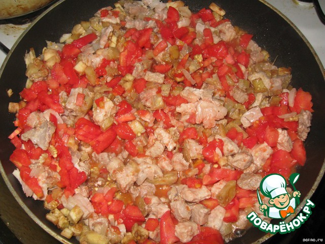 Мякоть баклажана, лук и свинину нарезать кубиками,