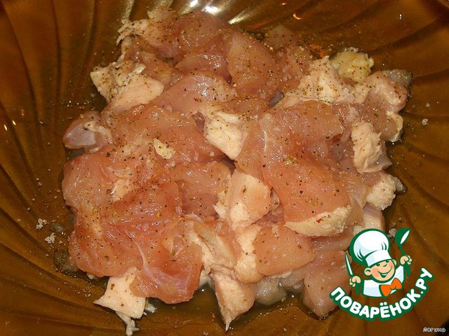 Мелко нарезаем куриную грудку, солим, перчим и оставляем минут на 15.
