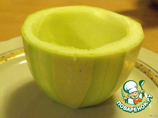 Моем, чистим кабачки. Разрезаем поперек (у меня получилось, что каждый кабачок на 4 части). Аккуратно, ложкой, вынимаем середину кабачка. Солим получившийся "стаканчик".