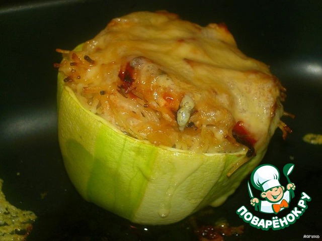 Кабачки фаршированные вермишелью с курицей и помидорами