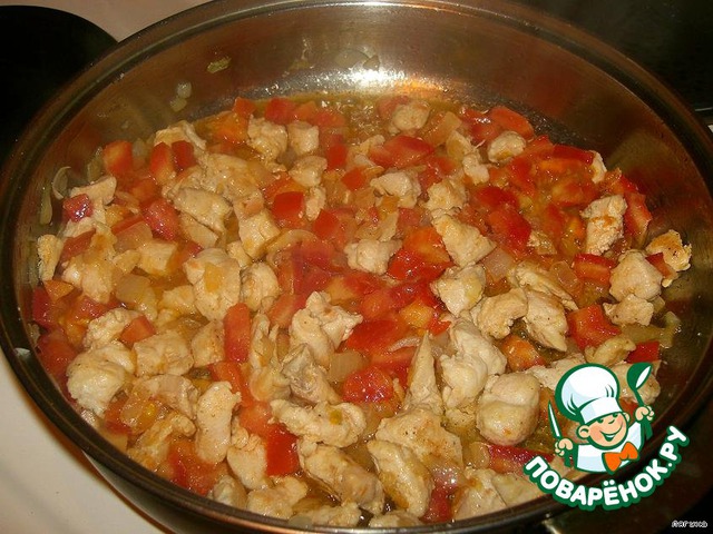 Жарим на сливочном масле мелко нарезанный лук до золотистого цвета.К луку добавляем куриные грудки, хорошо их обжариваем. Затем добавляем мелко нарезанный помидор и еще все вместе жарим минут 10.