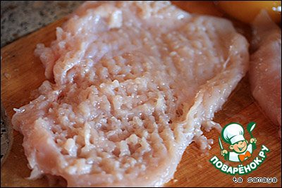 Теперь отбиваем куриные грудки очень хорошо, практически в ветхую "тряпочку".