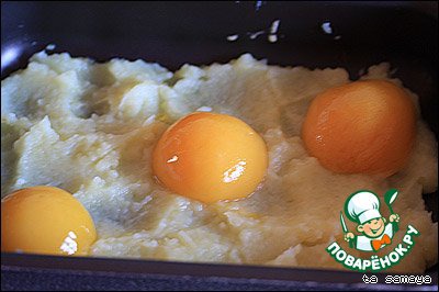 Вначале надо сварить картошку и приготовить пюре. Причем пюре обязательно готовится на молоке и (важный момент) добавьте в пюре немного сока из абрикосов. После этого на смазанный сливочным маслом противень нужно выложить часть пюре. Сверху красиво выкладываются половинки абрикосов.