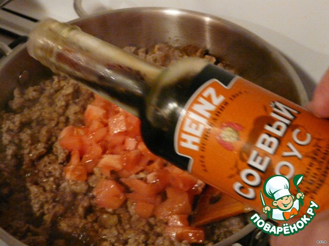 Когда сок из мяса испарится, добавить помидоры без кожицы, порезанные кусочками и немного соевого соуса. Снова накрыть крышкой. Подождать минут 5.