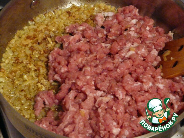 Обжарить мелкопорезанный лук со специями(обязательно положите имбирь), добавьте чеснок, еще погрейте. Затем добавляем говяжий фарш, перемешиваем. Пока фарш будет прогреваться, надо разминать его лопаткой, чтобы не образовалось крупных комочков. Накрыть крышкой.
