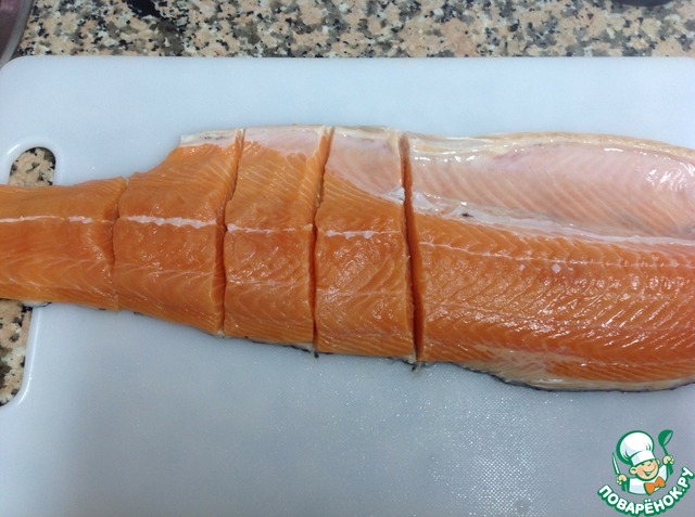 С Филе лосося снять кожу и порезать порционными кусками. Посолить и поперчить.