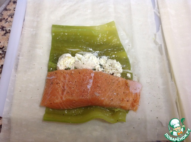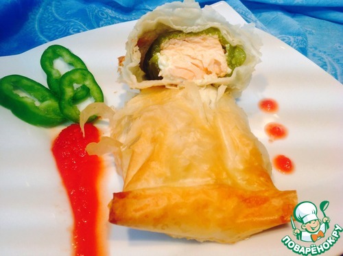 филе лосося положить на перец, добавить немного сыра и Завернуть в тесто фило.