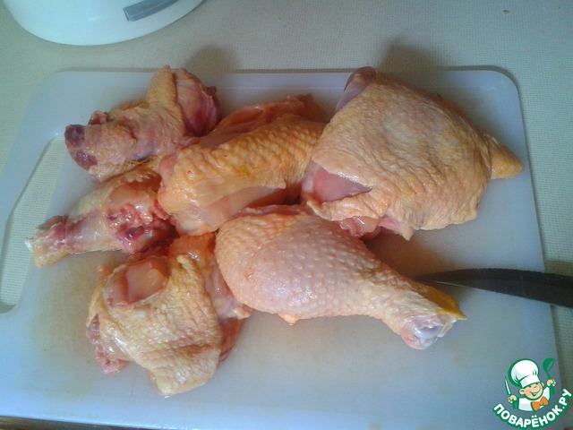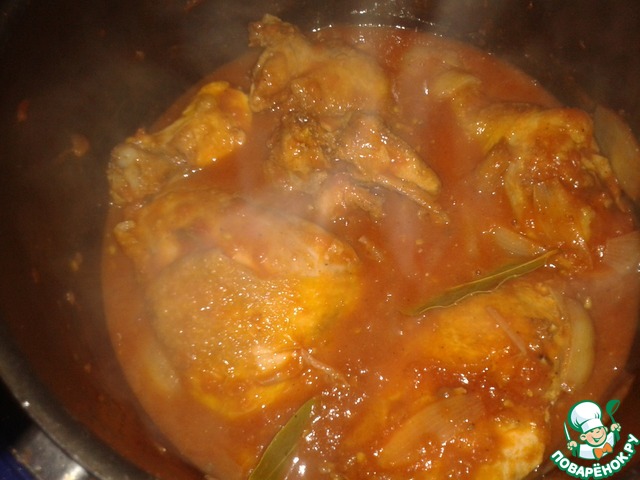 Вливаем вино, через 2 мин добавляем горячую воду так, чтобы петух был прикрыт. Накрываем крышкой и тушим около 50 мин.