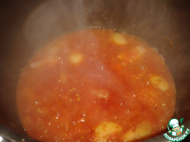 В кастрюлю наливаем оливковое масло. Добавляем лук, нарезанный крупными кусками, натертые на крупной терке помидоры и томатную пасту. Тушим с закрытой крышкой на среднем огне 5 мин.