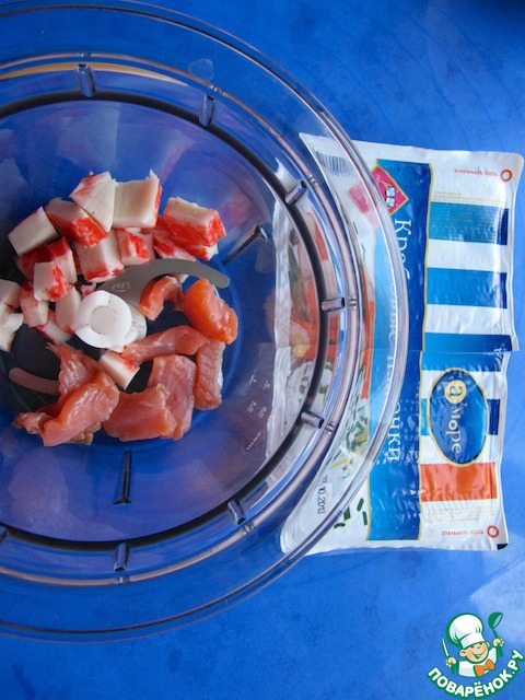 Для приготовления начинки измельчить подкопченный лосось и крабовые палочки.