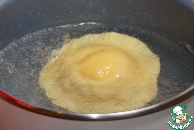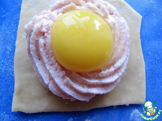 Сверху накрыть слоем теста, при этом нужно не повредить желток, чтобы он не потек!