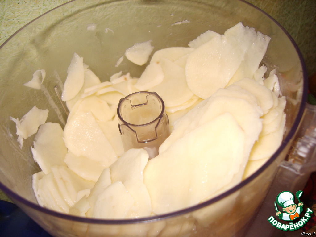 Чистим и режем тонкими пластинами картофель. Для этого у меня есть помощник - комбайн.