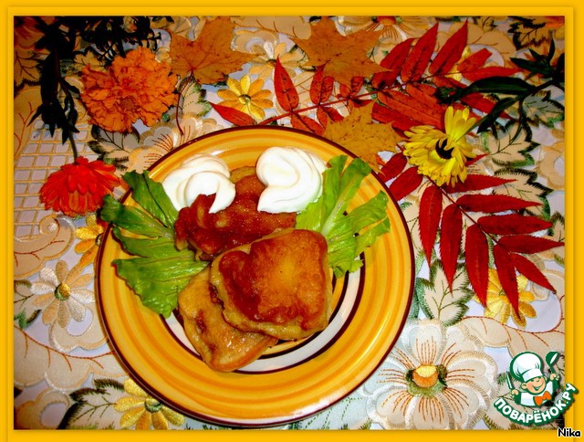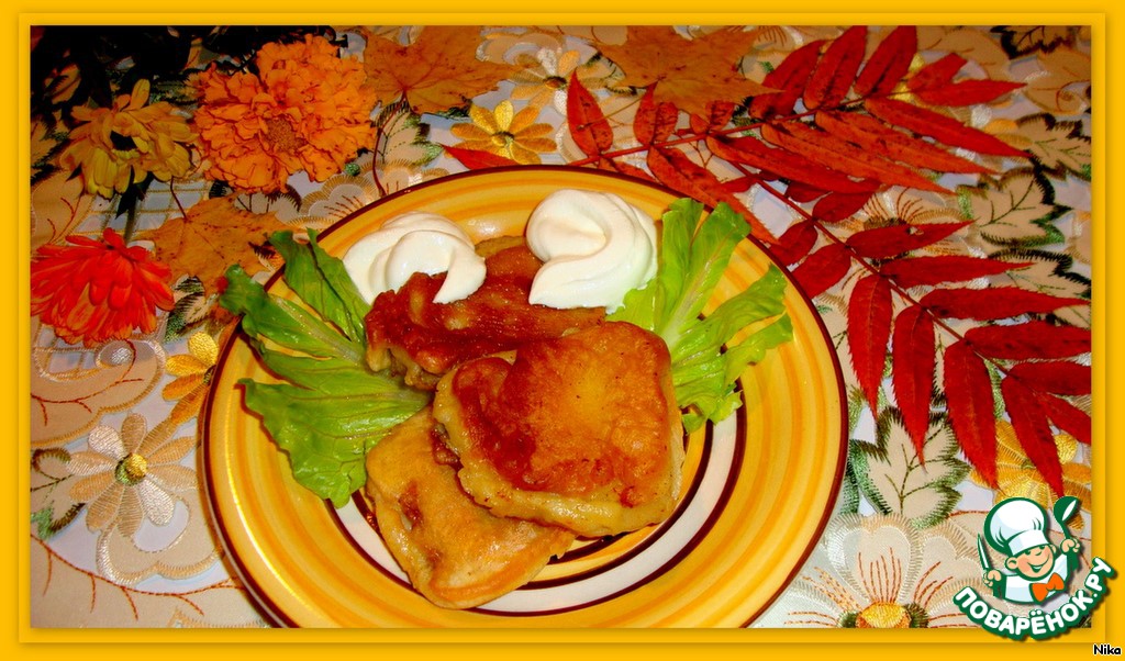 Тёмное пятнышко нужно срезать, т. к. здесь - твёрдое место от ножки. У меня был один большой и два маленьких гриба. Шляпки нарезать на порции. С обеих сторон обмакнуть в кляр и жарить на разогретой сковороде в растительном масле.