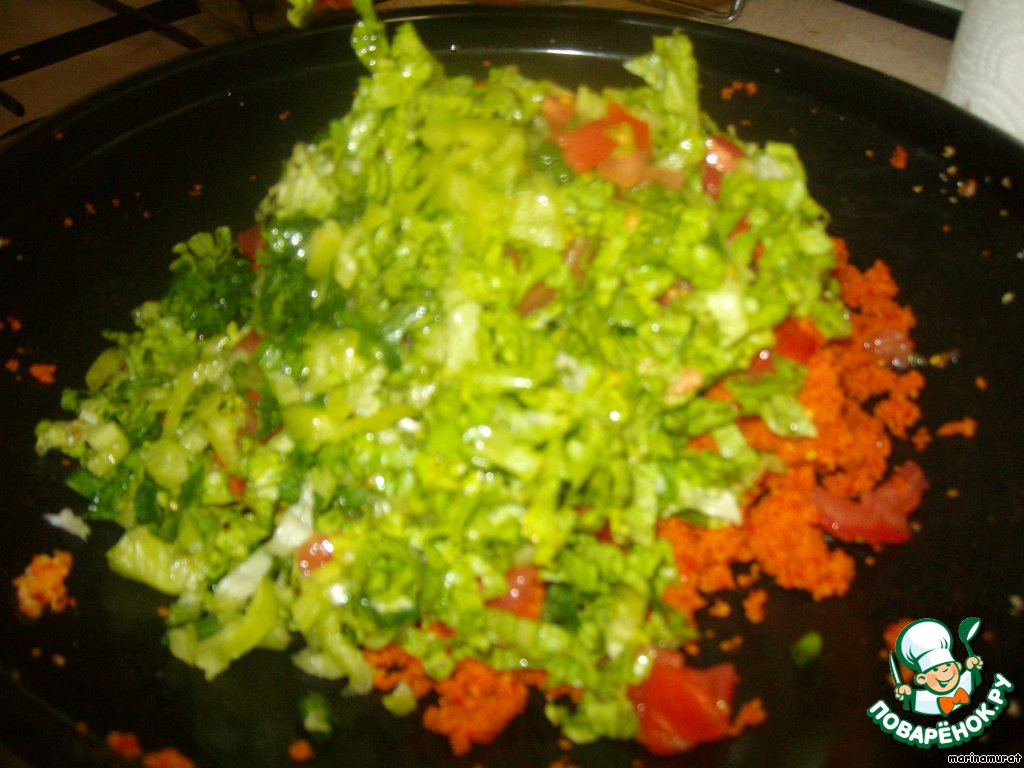 Теперь булгур надо посолить и можно отправлять овощи к булгуру. Перемешиваем все хорошо.