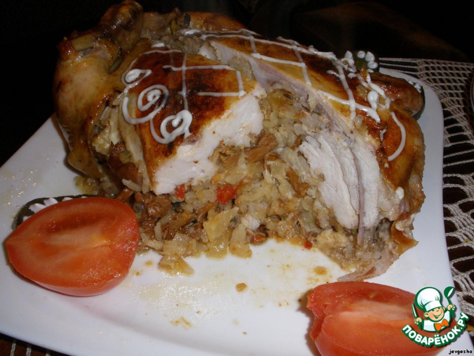 Спинку курицы соединить шпажками, оставив оверстие для заполнения начинкой. После закладывания всей начинки заколоть последние шпажки. Связать ножки вместе.