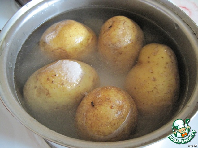 Выбрать гладкие, примерно одинакового размера клубни картофеля, с помощью щетки тщательно вымыть, не очищая от кожицы. Заливаем водой и ставим варить, когда картофель закипит добавить 6 ст. л соли и варить до готовности.