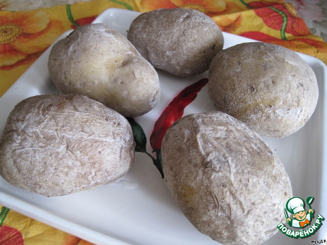| До лета еще далеко, но что-то захотелось печеной картошечки. Картошка, конечно, вареная, но с секретом. Этот рецепт прочитала давно, в какой-то книжке. Попробуйте, не пожалеете!!!! |