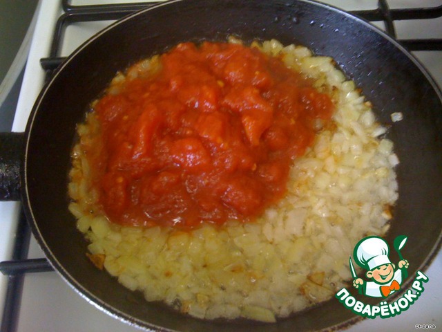 Обжарить лук репчатый до золотистого цвета вместе с помидорами.