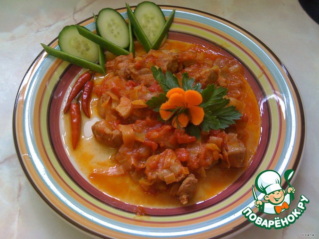 Соединить обжаренные помидоры с мясом и луком порей, потушить минут 20, посолить, и можно подавать на стол.
