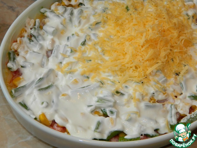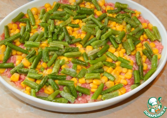 Сверху выложить кукурузу и стручковую фасоль. Прижать руками. Если фасоль замороженная, то размораживать не обязательно.