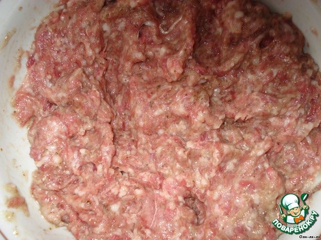 Готовим начинку. В фарш добавить лук, яйцо, соль и специи. Хорошо перемешать.