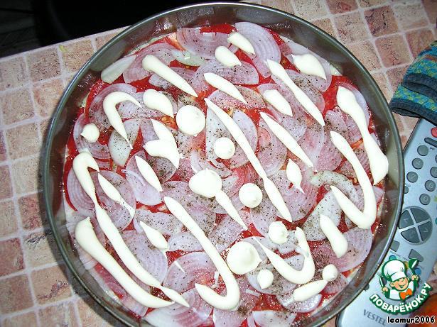 Помидоры очистить от кожуры и порезать кружками. Выложить на фарш. Лук порезать полукольцами очень тонко. Выложить сверху помидор. Посолить поперчить. Слегка смазать майонезом.