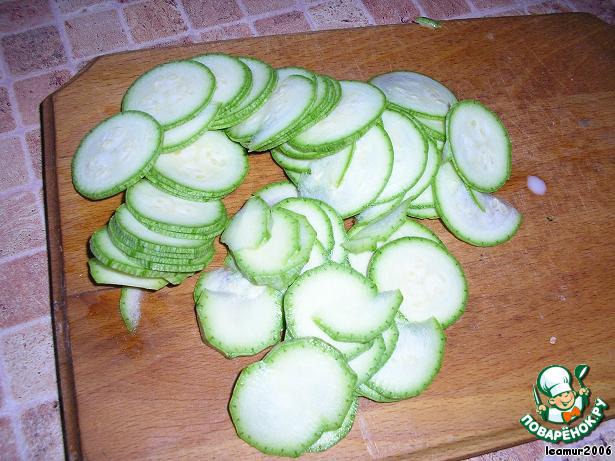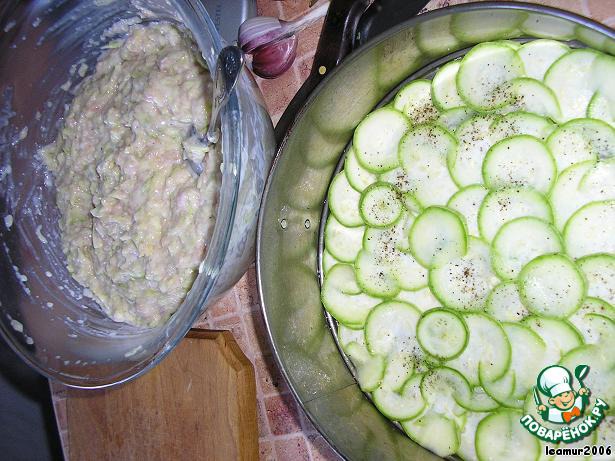 Кабачки порезать кружочками очень-очень тонко.Выложить дно формы, чтобы не было просветов.