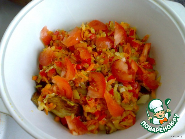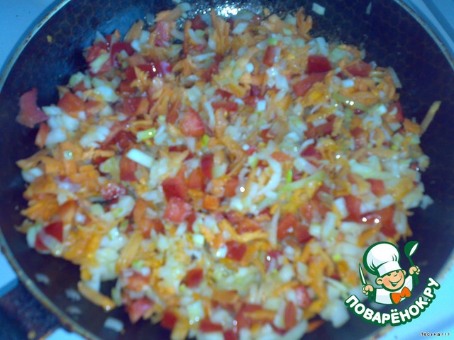 Затем морковь, лучок, и перчик режем мелко, морковь трем на крупной терке. Затем все обжариваем до полу-мягкости.
