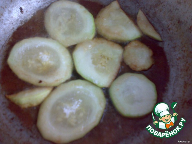 Все овощи очищаем. Т.к. главный персонаж у нас кабачок - начнем с него. Режем тонкими кружочками, затем обваливаем каждый кружочек в муке и обжариваем до золотистого цвета на растительном масле. Процесс трудоемкий, но это стоит того.