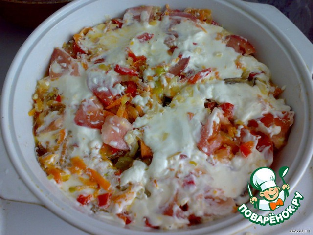 Когда положили последний слой из помидор, солим, и сверху кладем сметану. распределяем ее по поверхности и заливаем водой горячей, кипяченой. Чтобы она е покрывала поверхность, но вы ее видели.