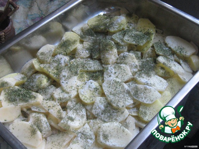 Картофель почистить, порезать кружочками, посолить и добавить специи - например сушеные укроп и петрушку