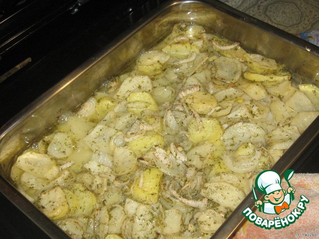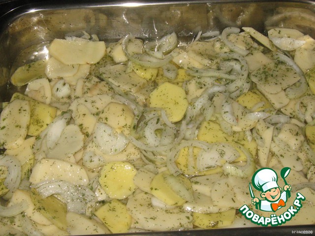 Лук порезать полукольцами, добавить на противень и полить все растительным маслом. Я добавила еще воды,но это было лишним т.к. картошка быстро приготовилась и плавала в воде
