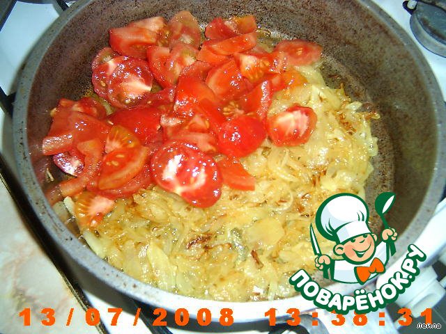 Нашинковать лук, обжарить, после положить помидоры от кожицы.