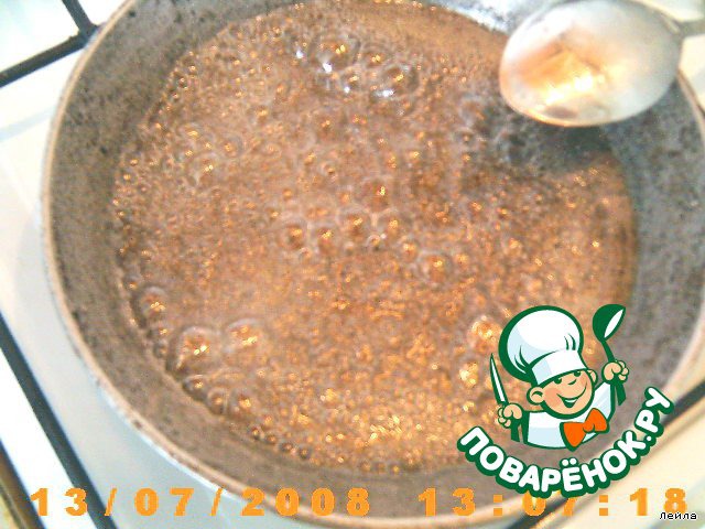 2 стол.ложки сахара + 2 ст.л.воды разогреть на сковородке, пока сахар не потемнеет,(для этого лучше взять посуду из тефали)
