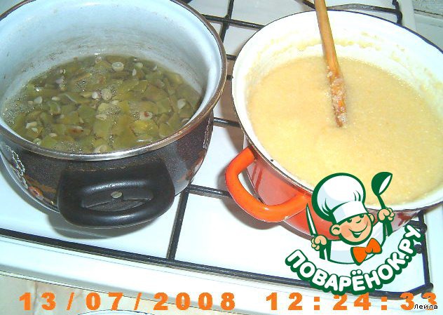 Отвариваем фасоль. В кастрюле вскипятить 1,5 л.воды, добавить соль. Размешивая венчиком всыпать крупу. Варить 25-30 минут, постоянно размешивать деревянной ложкой.
