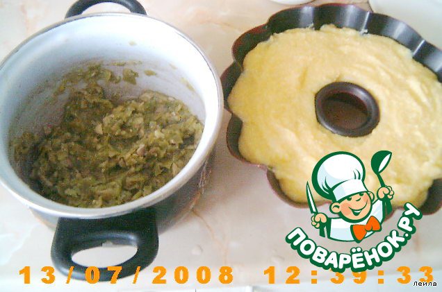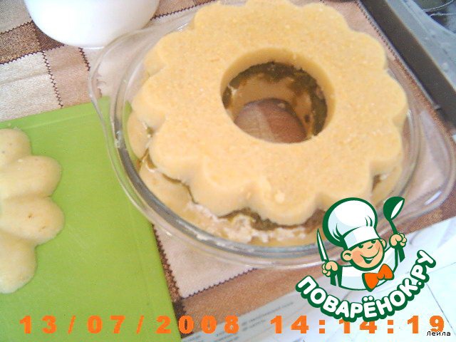 Накрываем следующим коржом поленты, сверху помидорно-луковую начинку.