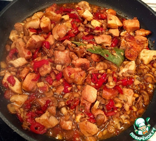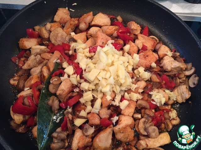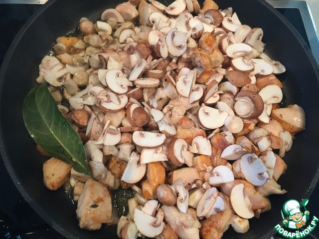 Обжарьте мелко нарезанную курочку, затем добавьте шампиньоны и снова обжарьте.