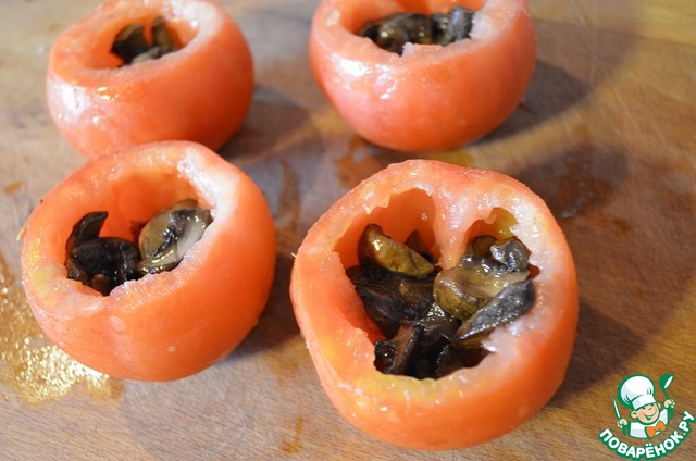 Из помидор вынуть сердцевину, выложить обжаренные грибы ( я выложила со шкварками).