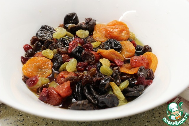 Залила сухофрукты коньяком и оставила пропитываться на сутки (это время не включено во время приготовления).