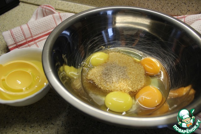 Для крема смешала яйца, два желтка, коричневый сахар и ванильный сахар и растерла добела.