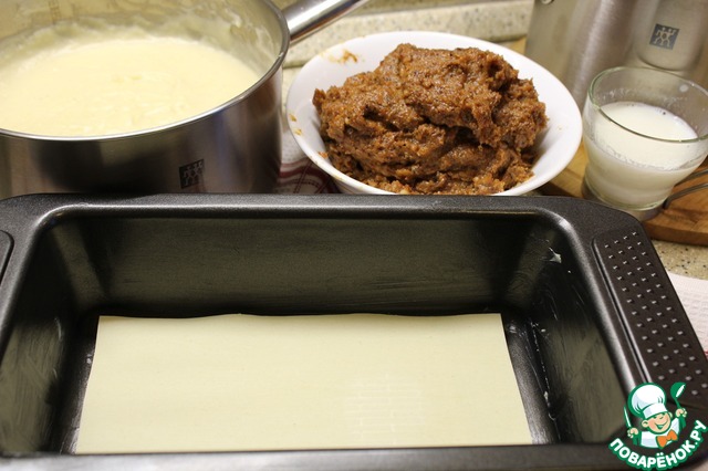 Подготовка листьев лазаньи зависит от того требуется их отваривать или нет. Если требуется, то надо отварить листья в кипящем молоке до полуготовности, отваривать надо по одному листочку. Для тех, у кого именно такая лазанья и указано большое количество молока в ингредиентах.