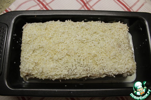 Сверху густо посыпала кокосовой стружкой и аккуратно налила молоко по краю формы, недоливая до верха сантиметра 1,5 -2. Этот и последующие шаги обязательны при использовании "готовых" листов лазаньи (у меня именно такие).