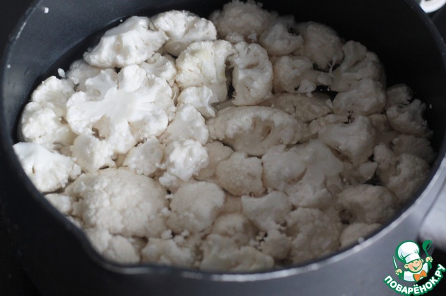 Цветную капусту разобрать на соцветия, залить холодной водой и довести до кипения.