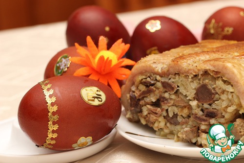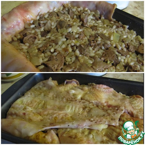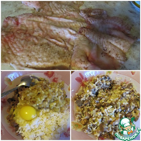 Для этого рецепта нужна куриная кожа, ее можно снять с курицы, предназначенной для бульона. Я использовала кожу с индюшки, она толще. Отваренный рис смешать с порезанными потрохами, обжаренным луком, добавить яйцо. В этом рецепте в качестве связующего элемента выступает рис и яйцо. Добавить мускатный орех, соль. перец.