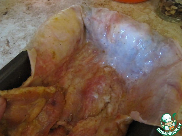 Форму для запекания смазать растительным маслом. Куриную кожу (у меня с индюшки) разложить по форме, чтобы края немного свисали.