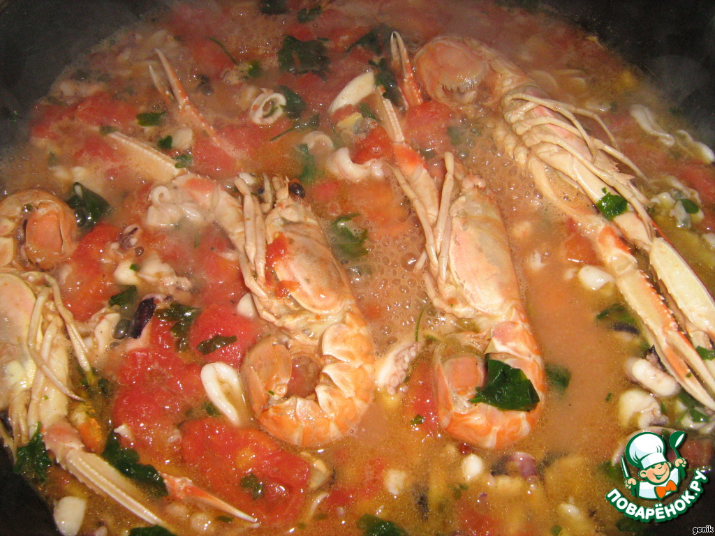 Добавляем ассорти морепродуктов и королевские креветки. Обжариваем на сильном огне. Вливаем белое сухое вино и даем ему испариться