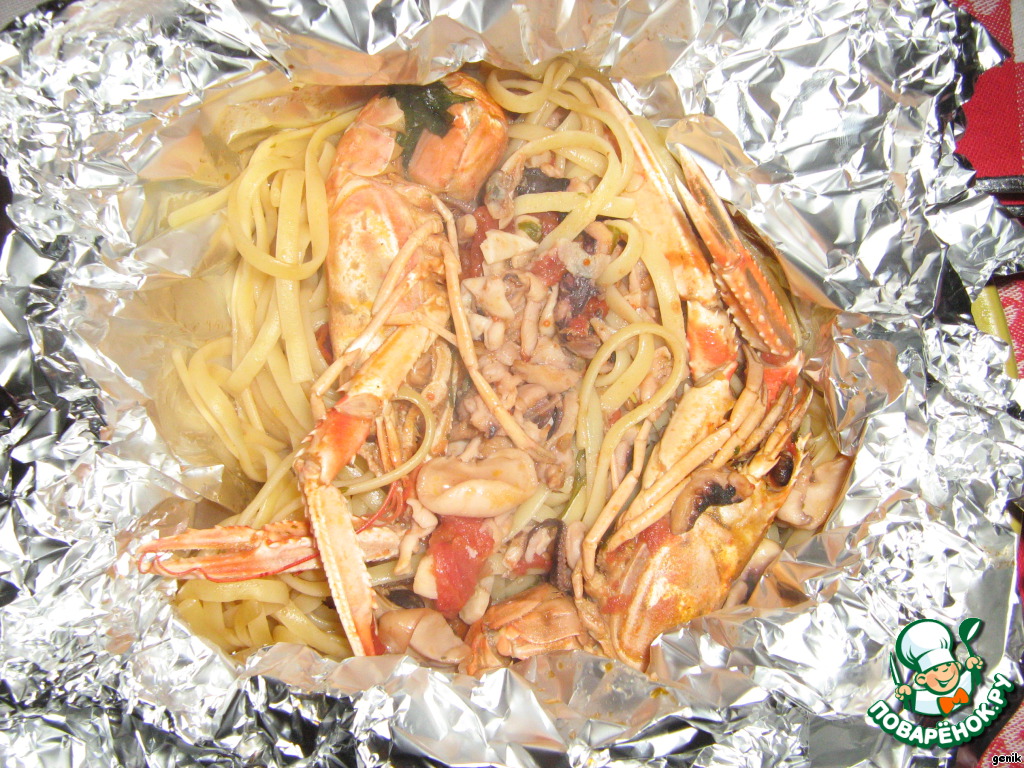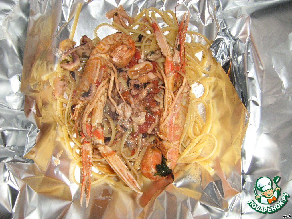 | Лингуине - итальянская паста, похожая на спагетти. Предлагаю вам способ приготовления в фольге этой чудесной пасты с морепродуктами. Аромат... непередаваемый! Угощайтесь! |