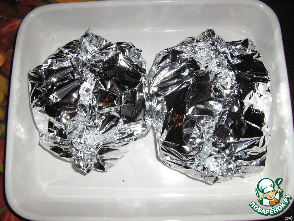 Фольгу герметично закручиваем, шов должен оказаться сверху. Помещаем в духовку, разогретую до 200град., на 20 мин.